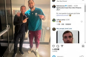 知名记者罗马诺更新社媒动态,晒出与巴黎门将多纳鲁马的合照,配文:“来自王子公园球场的明信片。PS:他到底能变强到什么地步?!”